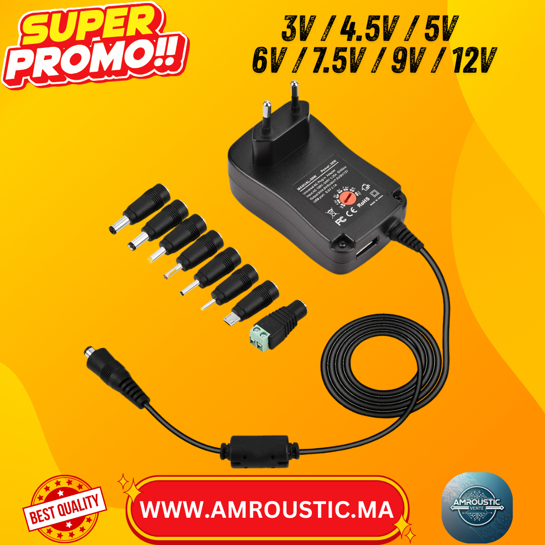 - 3V / 4.5V / 5V / 6V / 7.5V / 9V / 12V (courant max selon tension, jusqu’à 2A environ)