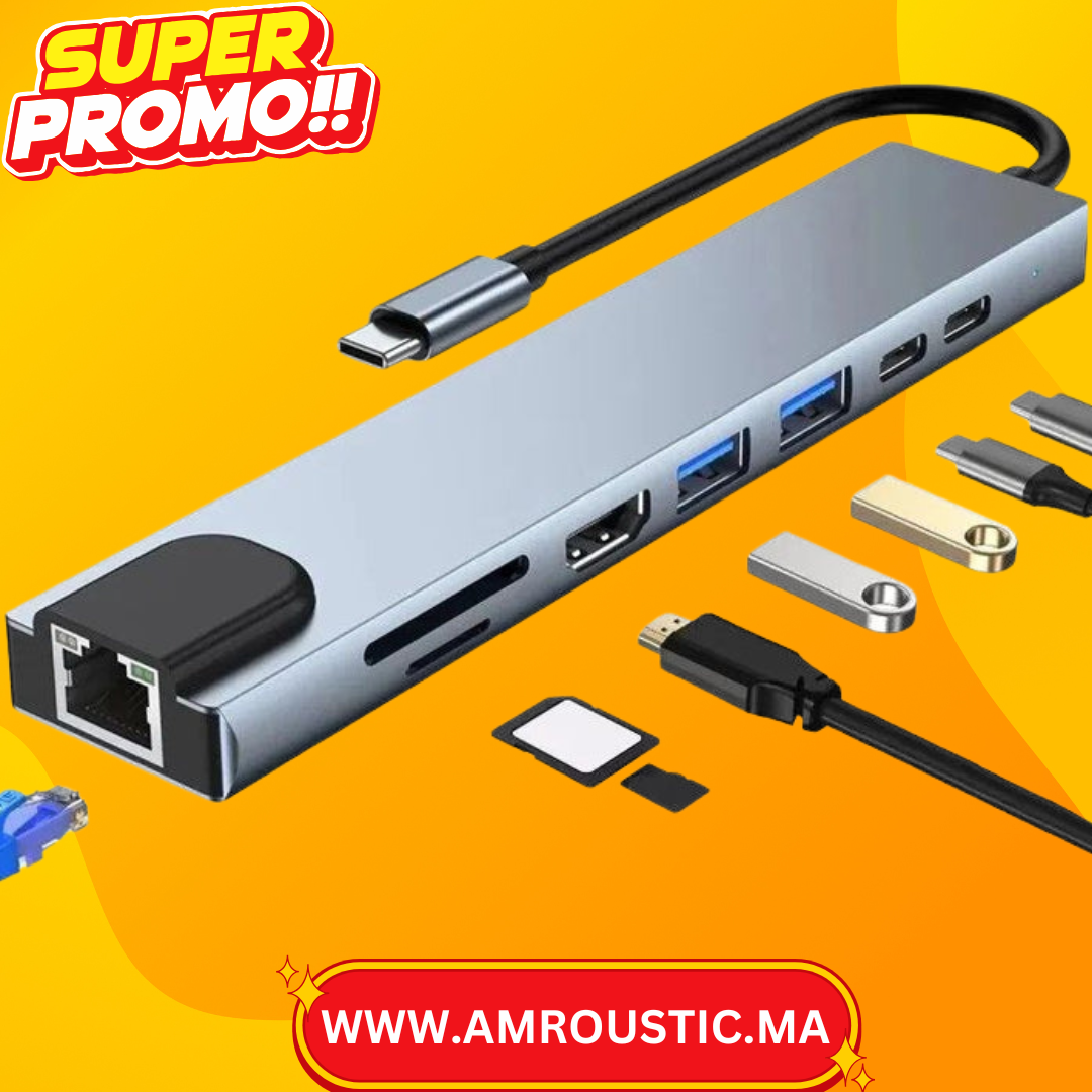 محول Airies USB C 8 في 1 من النوع C 3.1 إلى 4K HDMI مع قارئ بطاقات RJ45 SD/TF وشحن سريع PD لأجهزة الكمبيوتر المحمولة MacPle