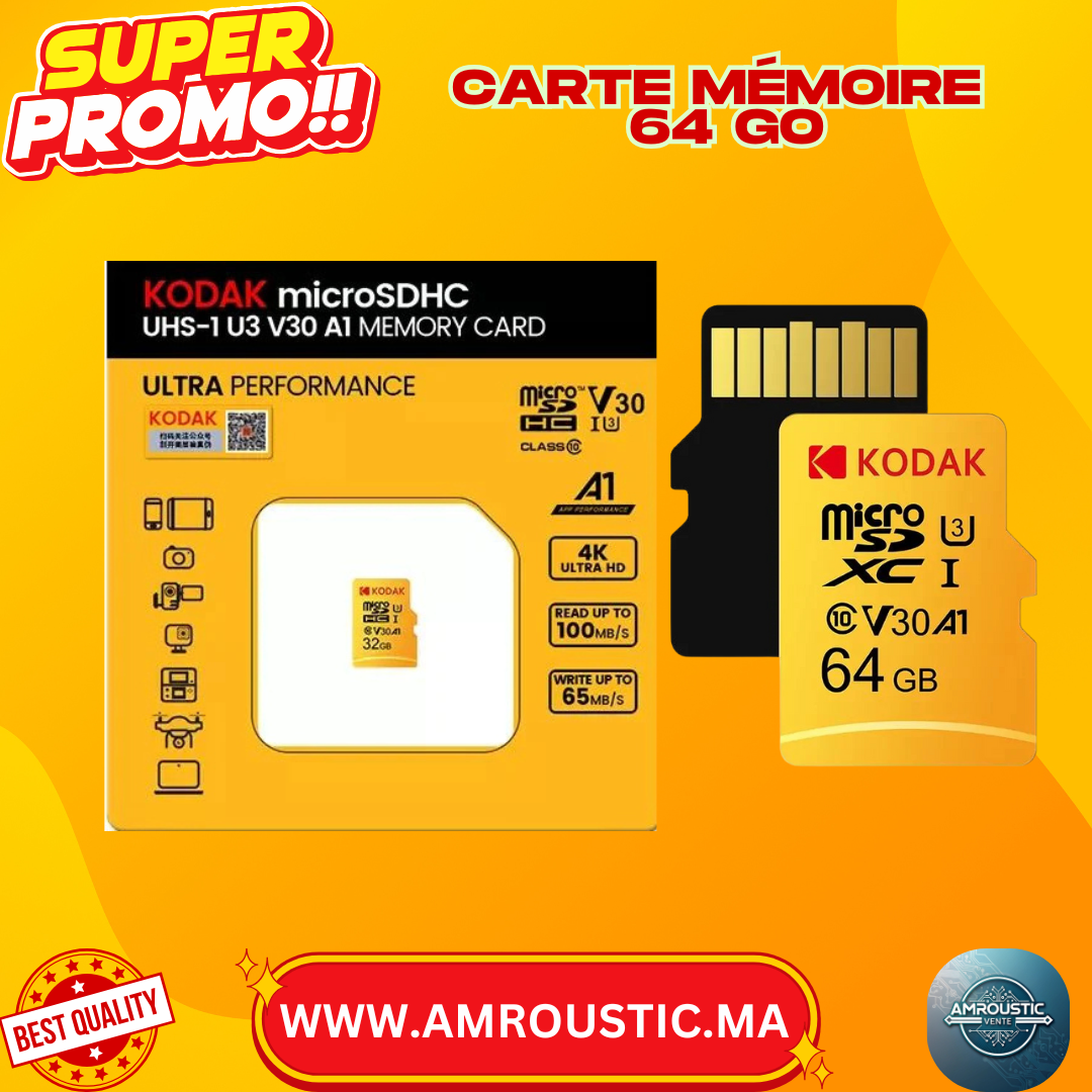 بطاقة ذاكرة فلاش Kodak Micro SD سعة 64 جيجابايت من الفئة 10 V30 U3 للهواتف