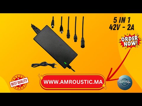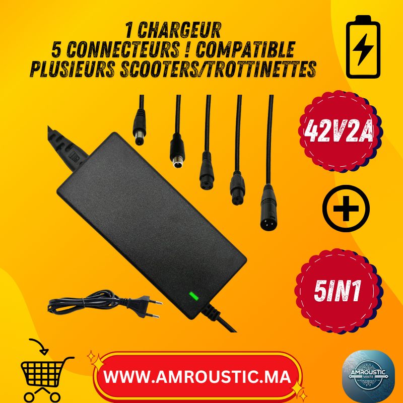 شاحن سكوتر كهربائي 42 فولت 2 أمبير - بطارية ليثيوم 36 فولت - 5 موصلات (تيار مستمر 5.5 مم / 8 مم / 12 مم / RCA / XLR) - مؤشر LED أحمر/أخضر