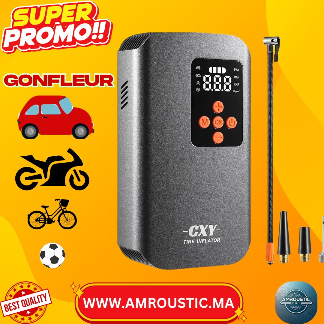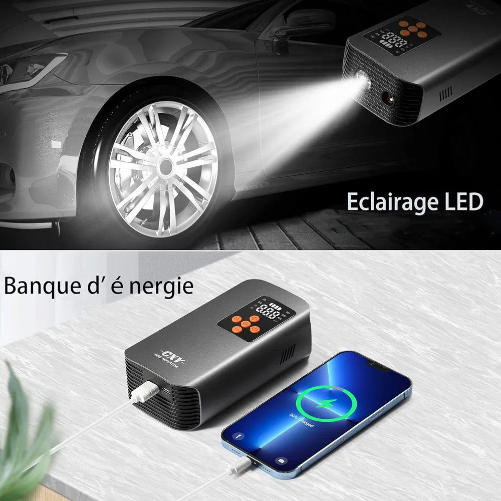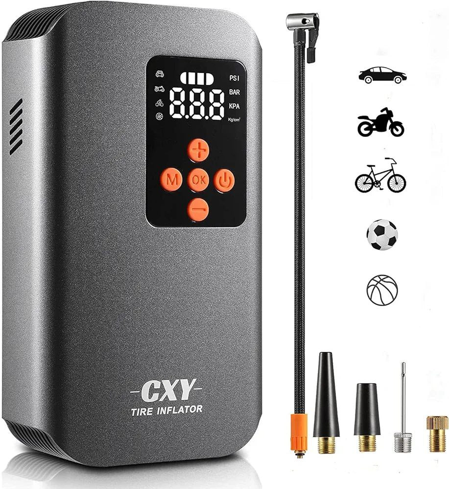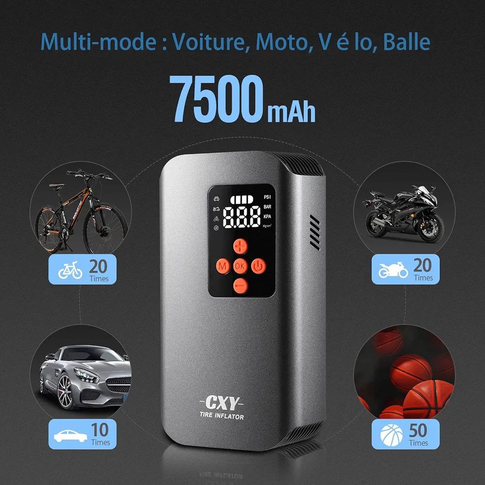 ضاغط هواء محمول من CXY، منفاخ إطارات صغير بسعة 7500 مللي أمبير/ساعة مع مقياس ضغط، شاشة رقمية وأضواء LED، كهربائي 150 رطل/بوصة مربعة للسيارات والدراجات النارية والكرات