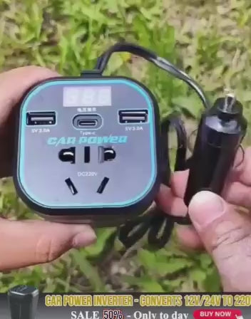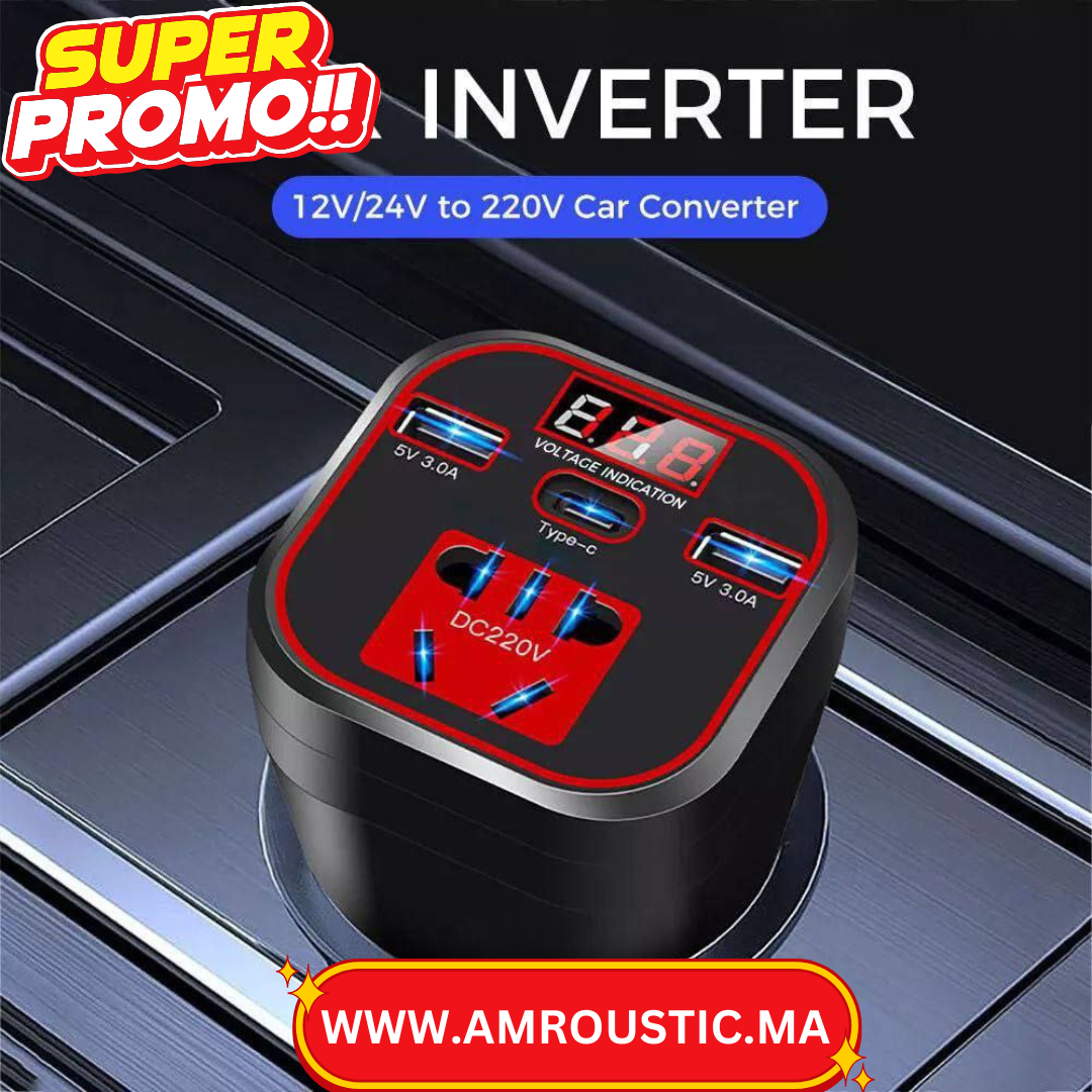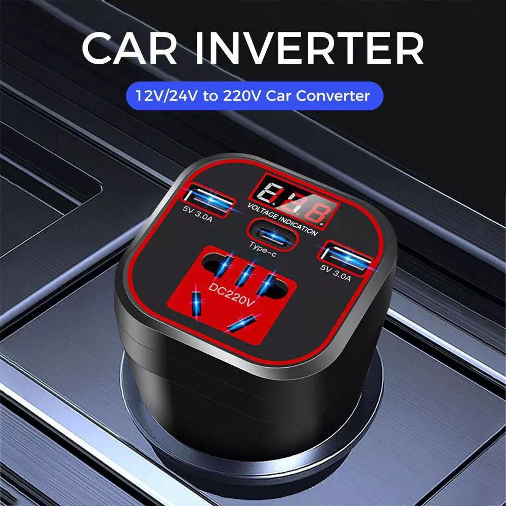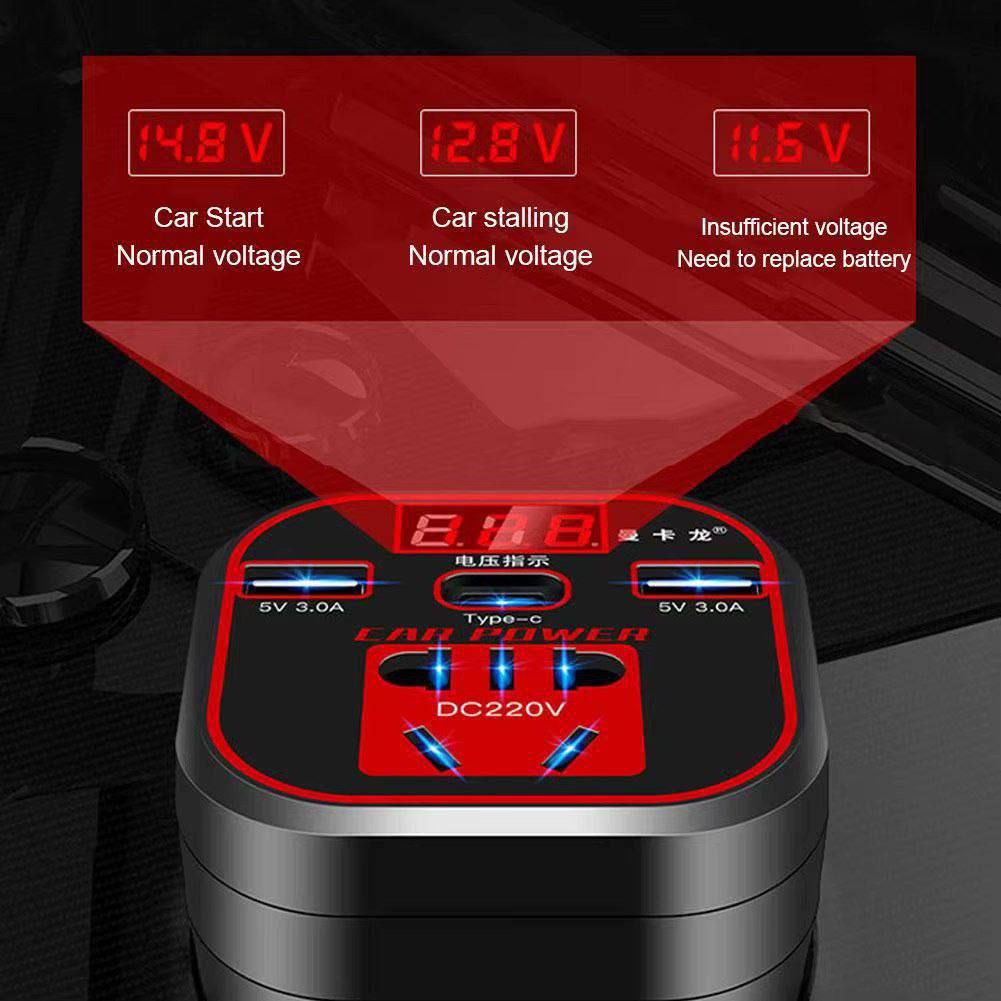 محول طاقة للسيارة مع شاشة LED، 3 منافذ USB، ولاعة لاجونا، تحذير الجهد، كمبيوتر محمول، جهاز لوحي، كاميرا، 150 واط، 12 فولت، 24 فولت إلى 220 فولت
