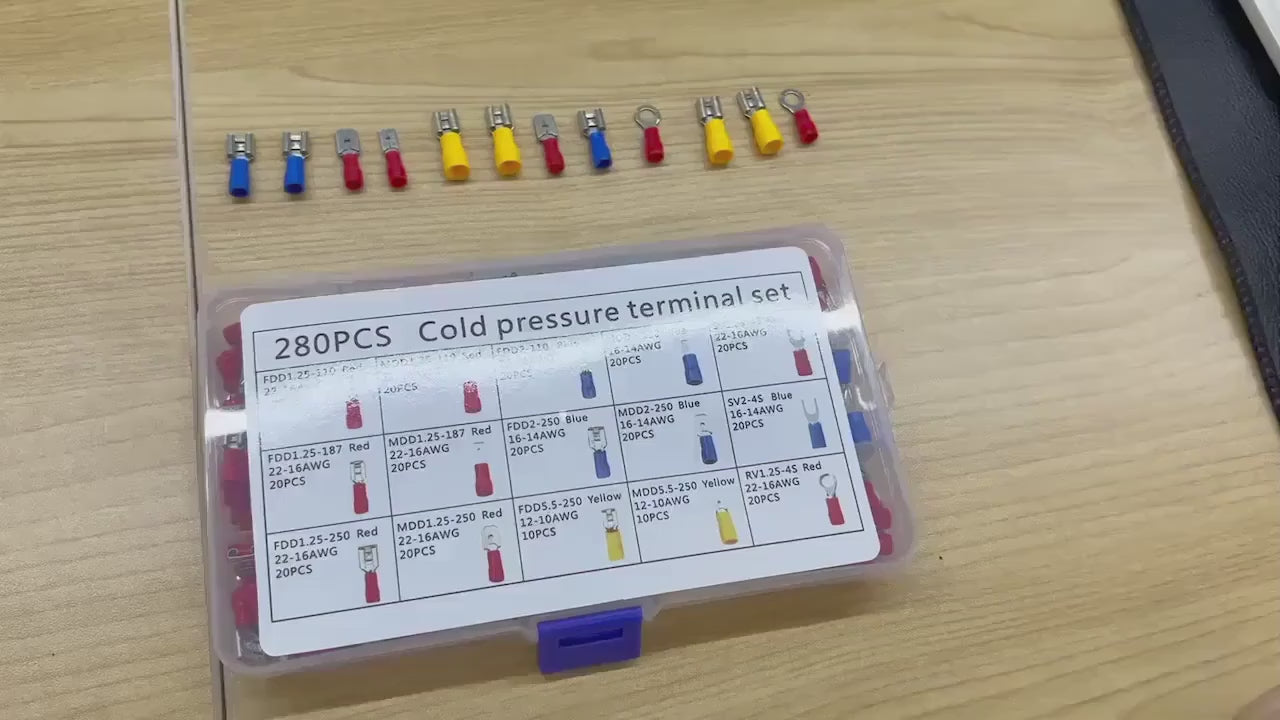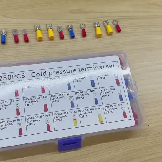 تتضمن هذه المجموعة المكونة من 280 قطعة الموصلات الرئيسية المستخدمة في الكهرباء: أطراف حلقية، أطراف متشعبة، أطراف مسطحة، حلقات معدنية، وموصلات ذكر/أنثى.