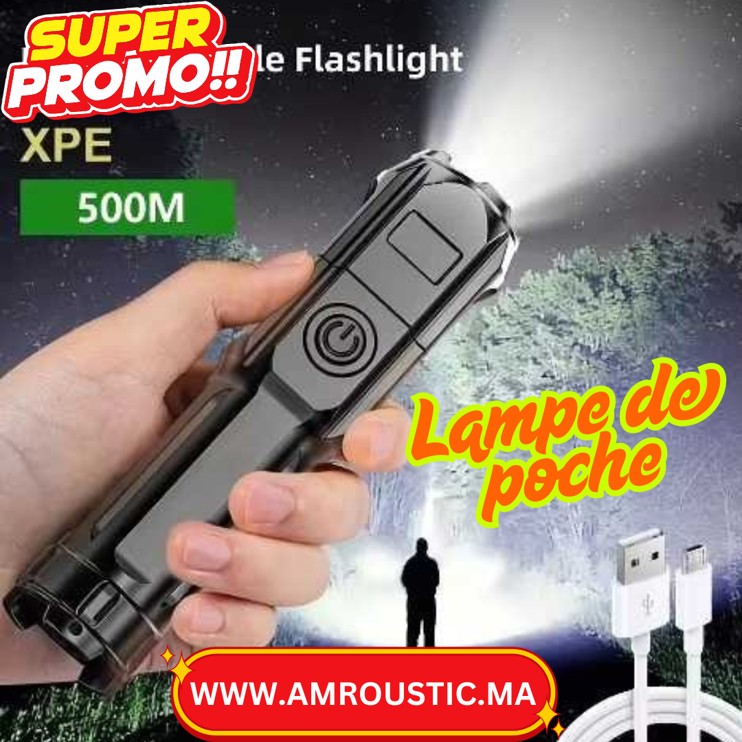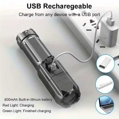 مصباح يدوي تكتيكي صغير تلسكوبي LED مزود بمنفذ USB قابل لإعادة الشحن ومقاوم للماء للتخييم في الهواء الطلق والصيد وصيد الأسماك