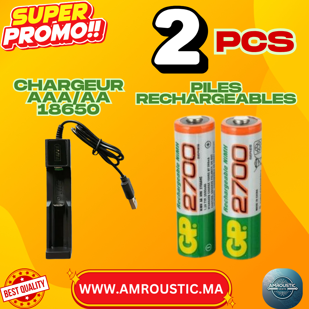 2 قطعة بطاريات AA قابلة لإعادة الشحن مع شاحن