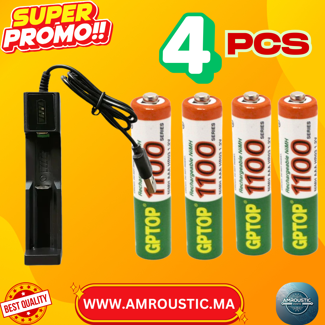 4 قطع بطاريات AAA قابلة لإعادة الشحن مع شاحن