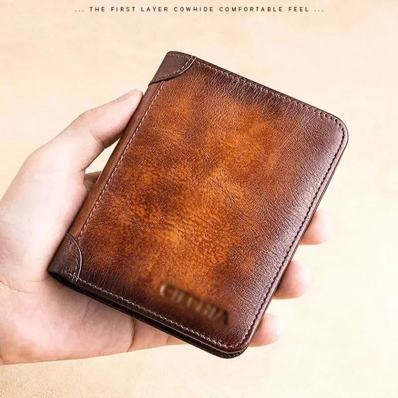 محفظة جلدية أصلية للرجال مزودة بخاصية حجب RFID وحقيبة نقود متعددة الوظائف وحامل لبطاقات الائتمان رفيعة وقصيرة بتصميم عتيق
