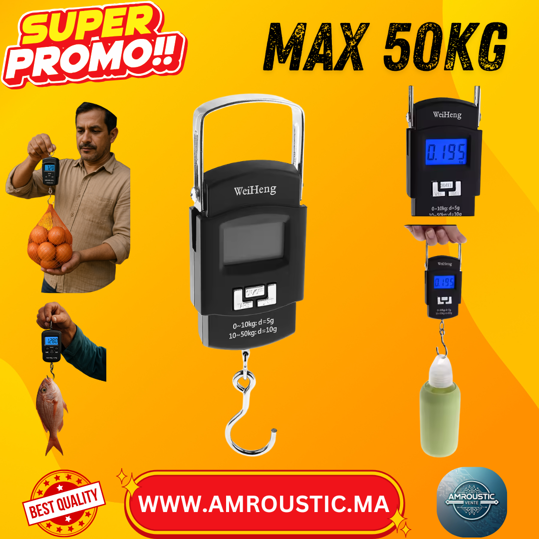 Elle permet de peser jusqu’à 50 kg avec une précision de 10 g, parfaite pour la pêche, les bagages, la cuisine ou le commerce ambulant.